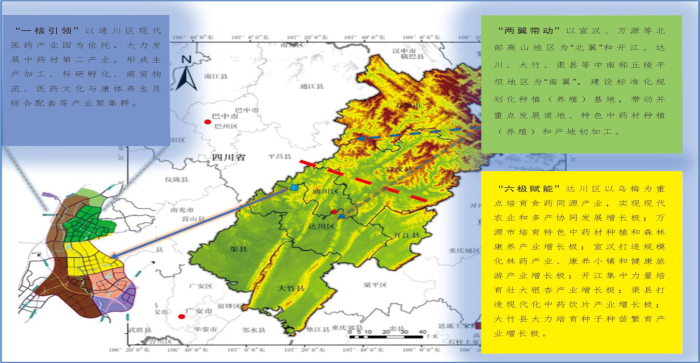 “六极赋能” 以达川、万源、宣汉、开江、渠县、大竹各为一极,发挥优势,突出特色,错位发展。达川区以乌梅为重点培育食药同源产业,实现现代农业和多产协同发展增长极;万源市依托生态富硒优势资源,培育特色中药材种子种苗繁育、原产地初加工和森林康养产业增长极;宣汉依托林地资源和生态优势打造规模化林药产业、康养小镇和健康旅游产业增长极;开江集中力量培育壮大银杏产业增长极;渠县依托省内外科研院校专家资源和中药饮片生产基础,打造现代化中药饮片产业增长极;大竹县着力培养中药材产业经纪人队伍,围绕川产道地药材建立中药材种植种苗繁育基地、建立标准化示范种植基地,打造特色中药材产业增长极。